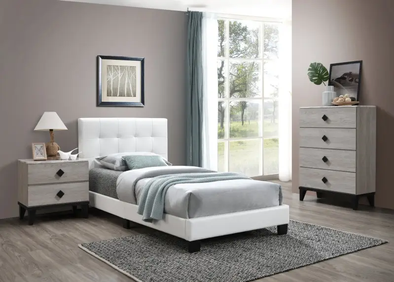 A lovely addition to your home, this bedroom set features a white leather headboard and bedframe draped in clean lines. A night stand and chest completes the collection for a superb resting space. Bed available in a twin or full size.